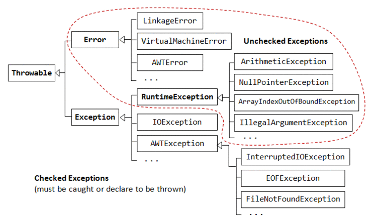 Java에서 오류(Error)와 예외(Exception)는 아래의 이미지와 같이 처리되도록 구현되어 있다.